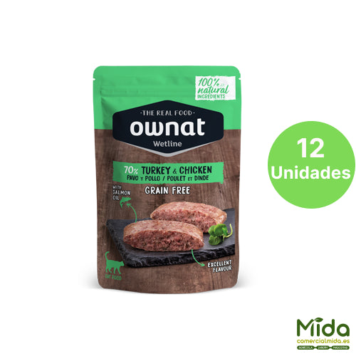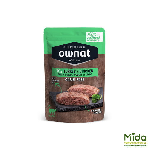 OWNAT Wetline Turkey & Chicken es un alimento húmedo 100% natural para gatos de todas las edades y tamaños, elaborado exclusivamente con carnes de verdad para lograr una alta palatabilidad. No contiene carnes reconstituidas, ni harinas, ni huesos, lo que se traduce en una calidad superior y una textura más auténtica. Además, es una receta sin cereales, especialmente digestiva y adecuada para gatos con alergias o intolerancias a cereales o gluten. Resulta ideal como alimento húmedo completo o como complemento para combinar con comida seca..