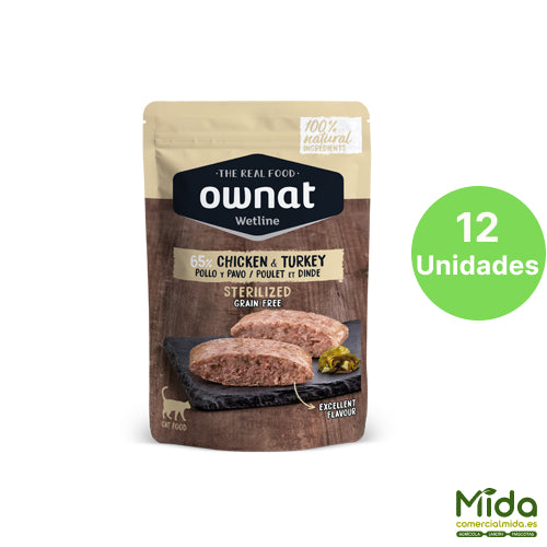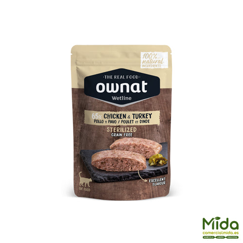 OWNAT Wetline Sterilized Chicken and Turkey, receta orientada a gatos esterilizados, que suelen presentar menor gasto energético y mayor tendencia al aumento de peso, por lo que un bajo % de grasa resulta coherente con el objetivo de control calórico.