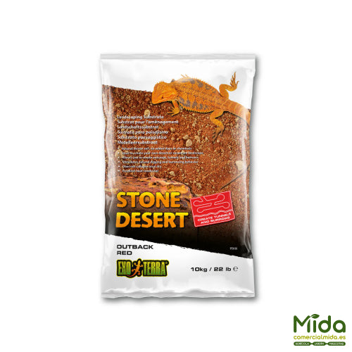 El Exo Terra Outback Red Stone Desert es un sustrato de arena para terrascaping que imita el suelo natural de regiones áridas como desiertos y sabanas, donde el terreno no es solo arena, sino una mezcla de arena, granito descompuesto y arcilla que origina formaciones rocosas. Permite crear un paisaje desértico realista con madrigueras frescas y húmedas y zonas elevadas de asoleo más cálidas, ayudando a la termorregulación y a que los reptiles absorban humedad a través de la piel mientras descansan. Al humedecerlo ligeramente, puedes moldear colinas, túneles y plataformas; una vez seco, el sustrato conserva la forma, no se derrumba y sigue permitiendo el comportamiento natural de excavación, además de poder usarse para fijar elementos decorativos pesados como ramas o rocas, o combinarse con Stone Desert o Desert Sand para completar el diseño del terrario.