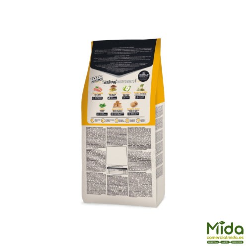 Carnes 36% (carnes desidratadas 26%, frango fresco * 10%), milho integral * (20%), gordura de frango, trigo integral * (9%), todo cevada * (7%), ervilhas inteiros * (5%) , arroz integral * (5%), proteas de milho, levedura de cerveja * (1,5%), proteína hidrolisada frango, peixe desidratado, maçã fresca * (1%), óleo de salmão, polpa de beterraba, extracto de malte, frutose e mananoligossacarídeo, 0,02 % ervas botânicas (erva-doce *, flor de camomila *, anis verde *), yuca schidigera. * Ingredientes naturais.