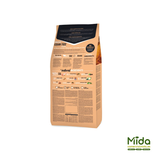 Alternativa premium orientada al crecimiento, con enfoque claro en cachorros que necesitan una receta sin pollo y con ingredientes seleccionados por su baja capacidad alergénica. Al ser grain free, utiliza legumbres y tubérculos como fuentes de carbohidratos, lo que mejora la tolerancia en perros sensibles. Su elevado contenido energético y su equilibrio de minerales contribuyen a un desarrollo físico sólido. Los aportes de omegas, junto con antioxidantes naturales, refuerzan el bienestar general durante una etapa de alta demanda.