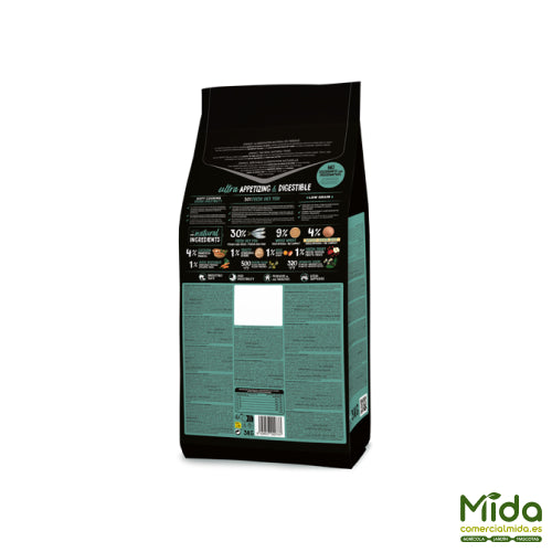 30% pescado fresco + 12% hidrolizado de salmón: proteína altamente digestible y muy palatable.