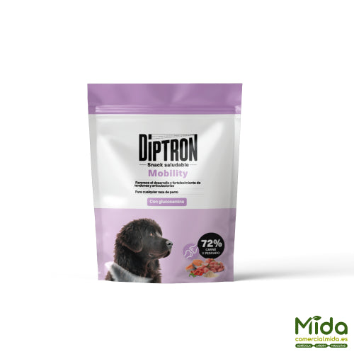 Quimunsa DIPTRON Snack Saludable Mobility Perro 150 g es un alimento complementario semi-húmedo para todas las razas que funciona como premio funcional. Combina 72% de carne y pescado (pollo, jamón serrano y salmón) con GLUCOSAMINA y CONDROITINA para mejorar la agilidad y favorecer el desarrollo y fortalecimiento de tendones y articulaciones. Aporta alto valor proteico, es bajo en grasa e incluye Omega 3, Omega 6 y Omega 9 para un apoyo integral. Su alta palatabilidad y textura semi-húmeda facilitan la masticación diaria sin descuidar la salud articular