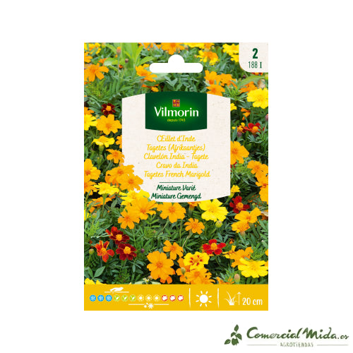El Clavelón de la India Miniatura Variado de Vilmorin es una planta anual enana que ofrece una floración abundante en tonos que van del amarillo claro al naranja oscuro. Su porte bajo y compacto (20 cm de altura), junto con su resistencia al calor y a enfermedades, la convierten en una opción ideal para macizos, jardineras y bordes. De fácil cultivo, esta variedad es perfecta tanto para jardineros novatos como para expertos.