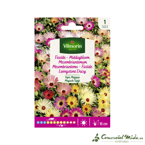 El Mesembriantemum Variado de Vilmorin es una planta anual rastrera que despliega flores en forma de sol, de colores vivos y brillantes que se abren con la luz directa. Con una altura máxima de 10 cm, es ideal para borduras, rocallas y jardineras soleadas. Su crecimiento rápido, resistencia al calor y floración continua durante todo el verano la convierten en una elección perfecta para espacios exteriores soleados de bajo mantenimiento.
